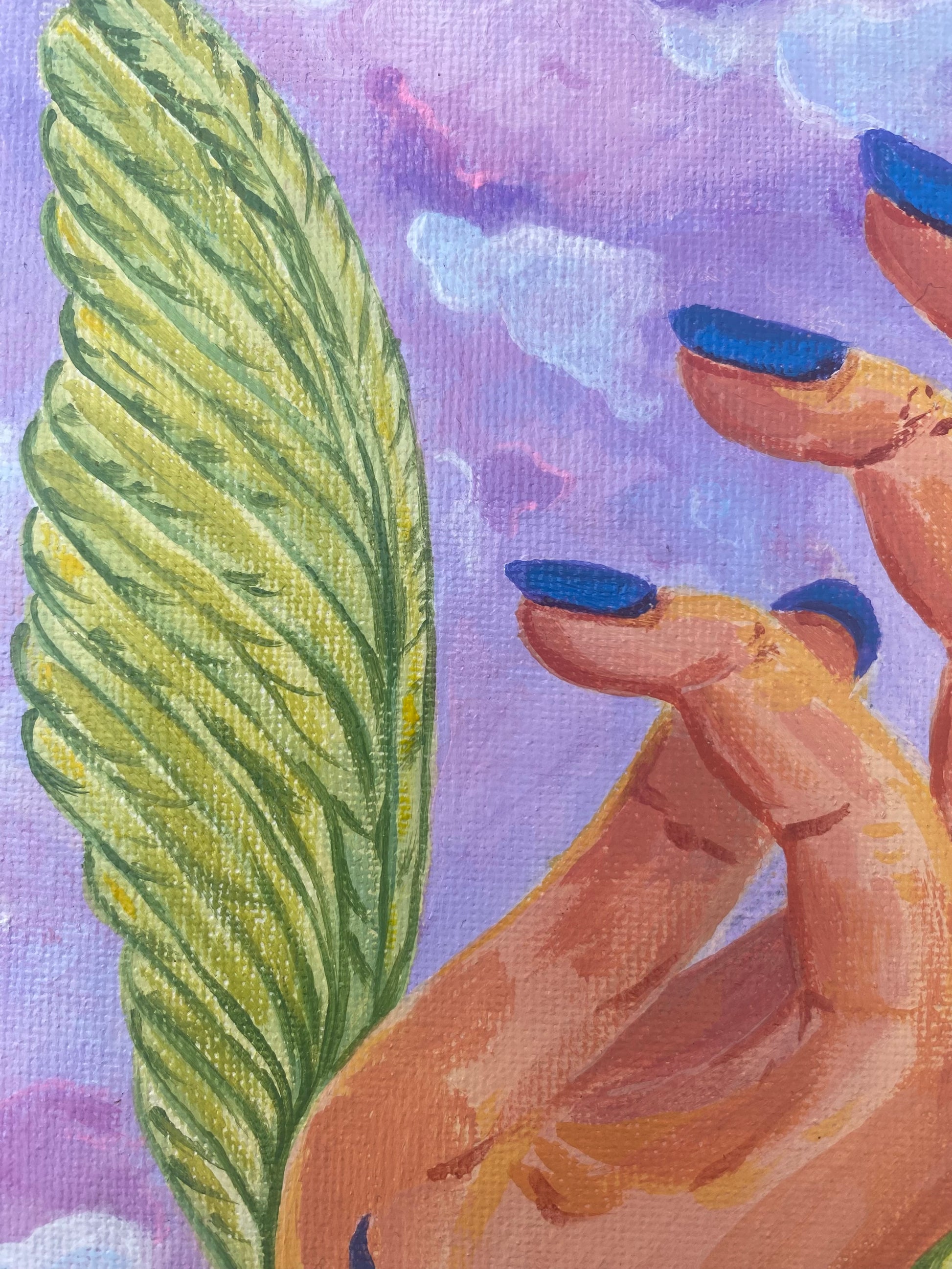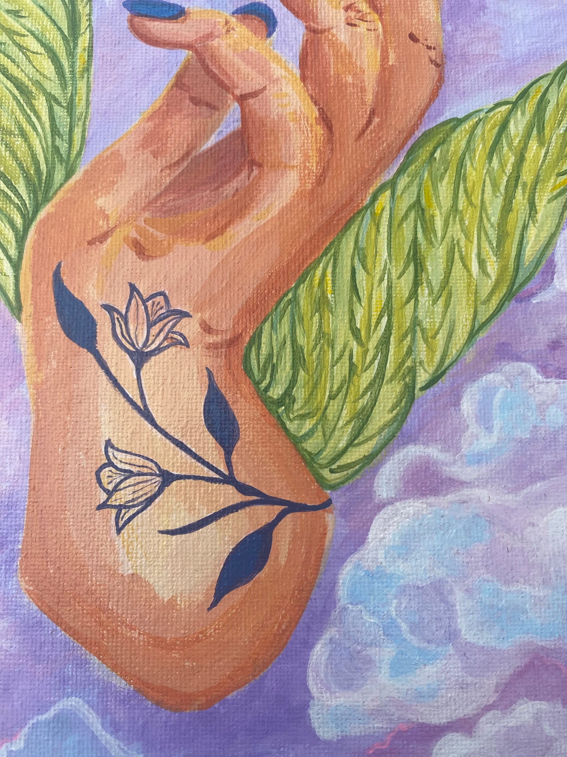 Obra vibrante y simbólica que fusiona el contraste entre la delicadeza y la rebeldía. Una mano tatuada y alada se eleva entre nubes oníricas, sosteniendo un cigarrillo como gesto de libertad.