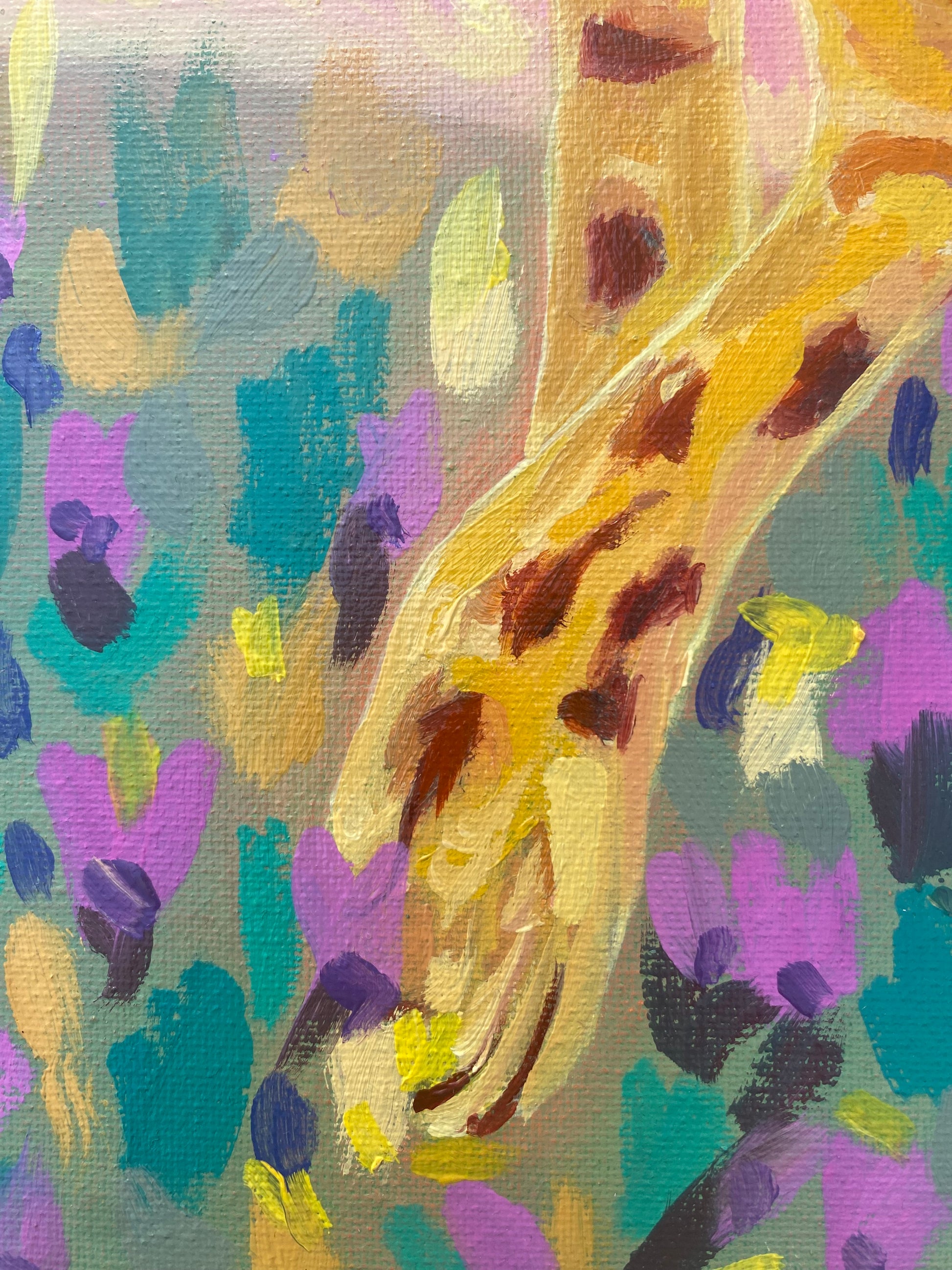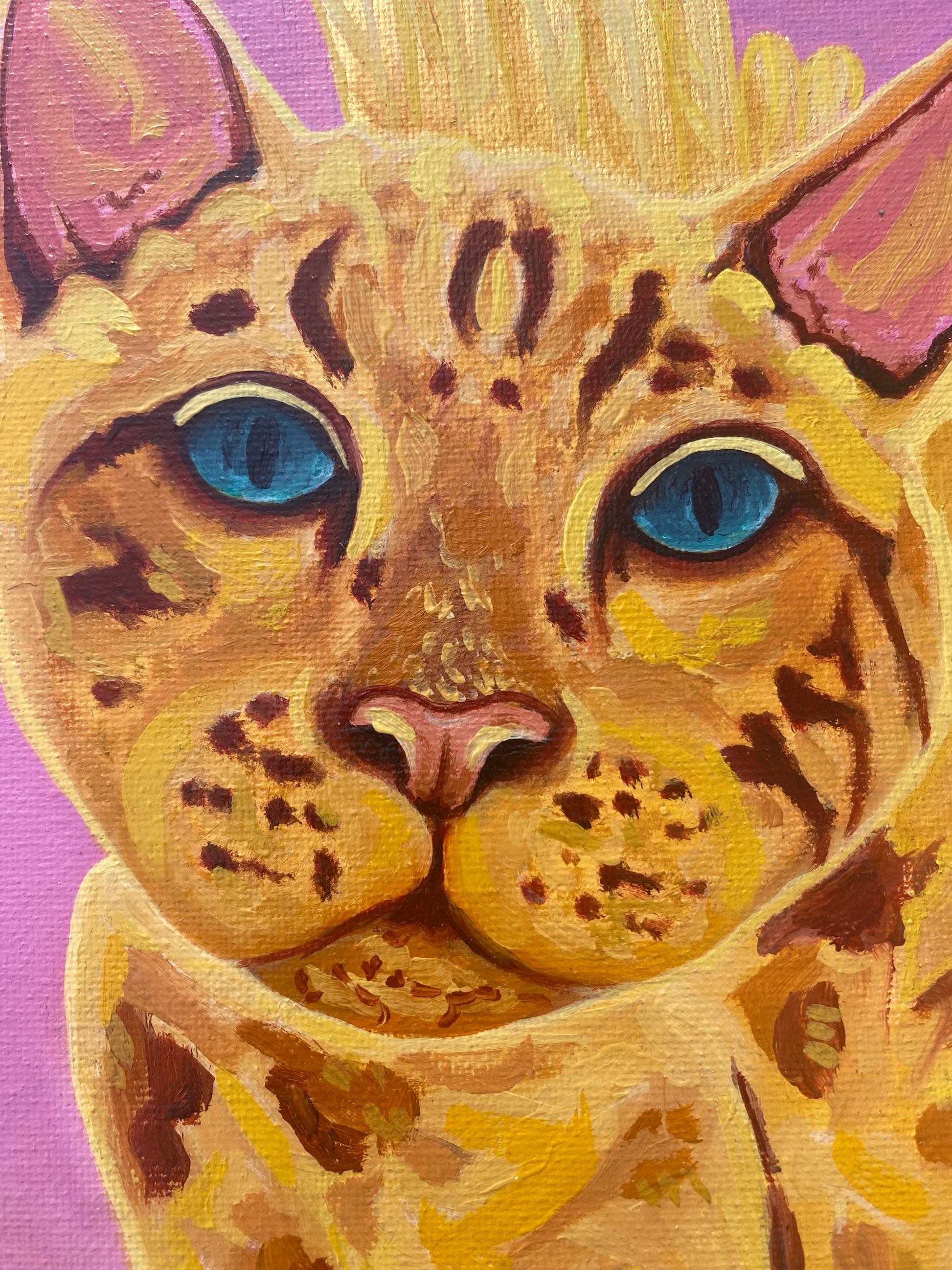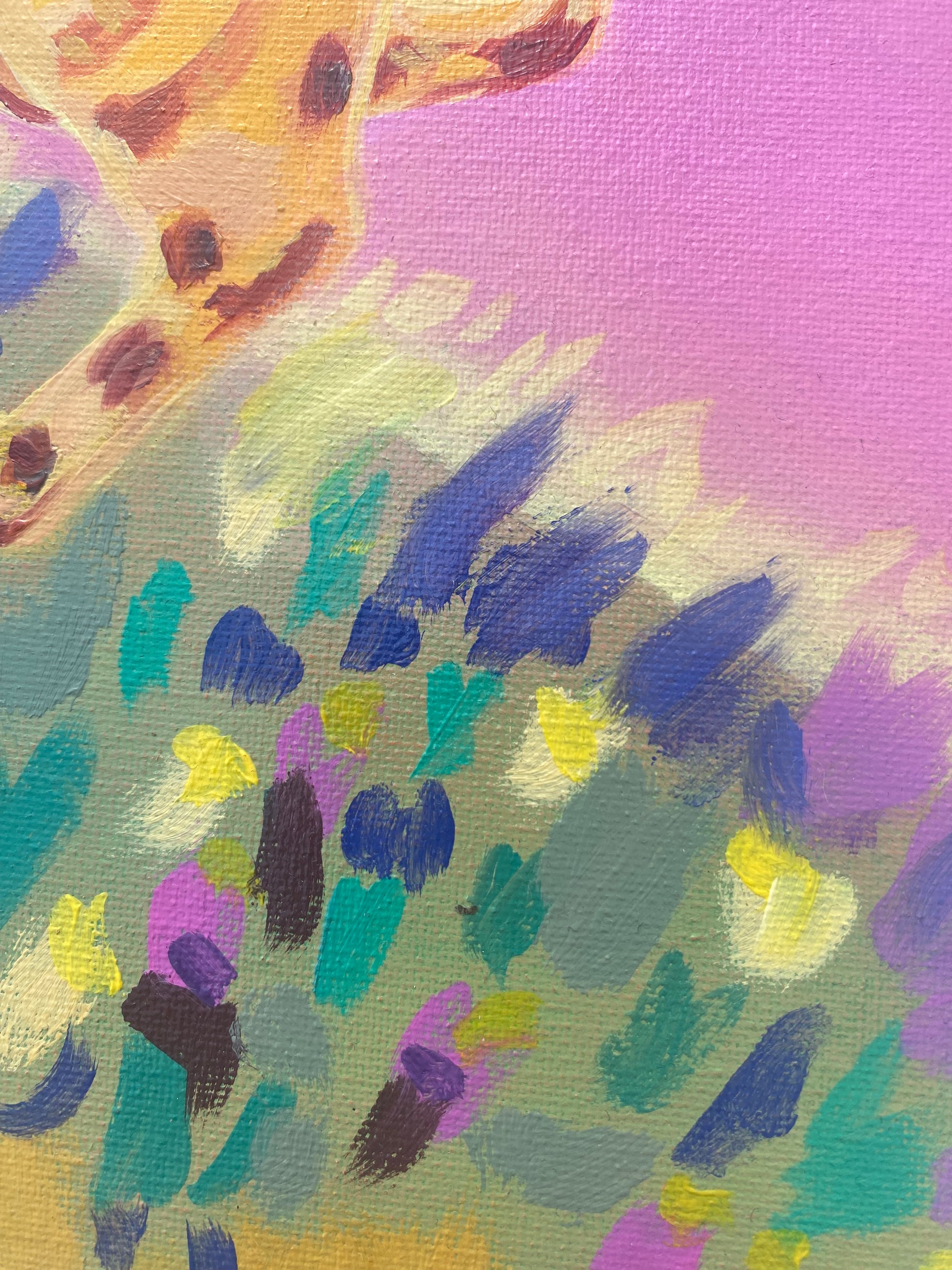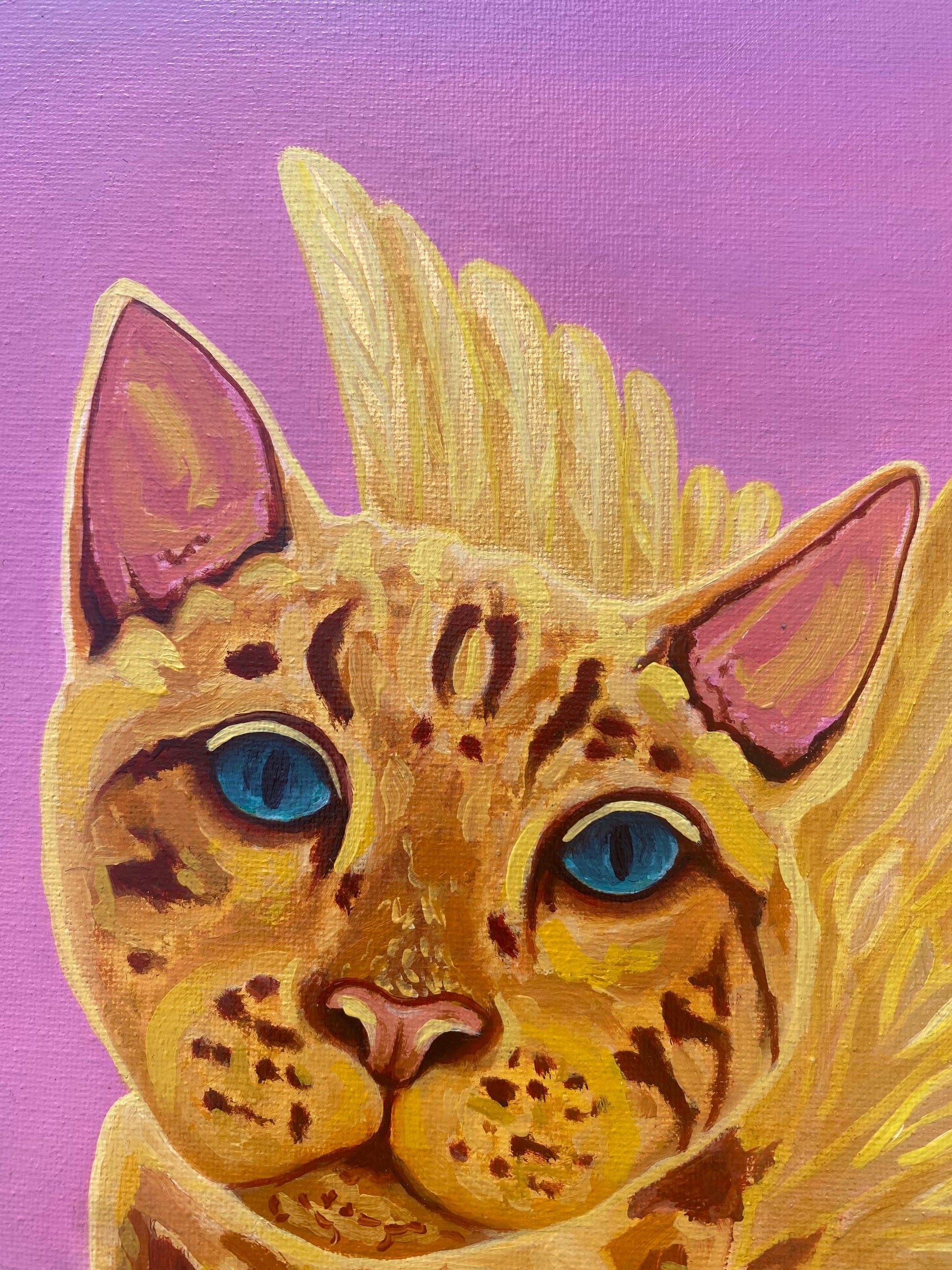 Gato alado y moteado en tonos amarillos y fucsias que camina con gracia sobre un campo vibrante de lavandas. Una obra que mezcla fantasía y ternura, transmitiendo libertad, presencia y dulzura en un entorno de ensueño.