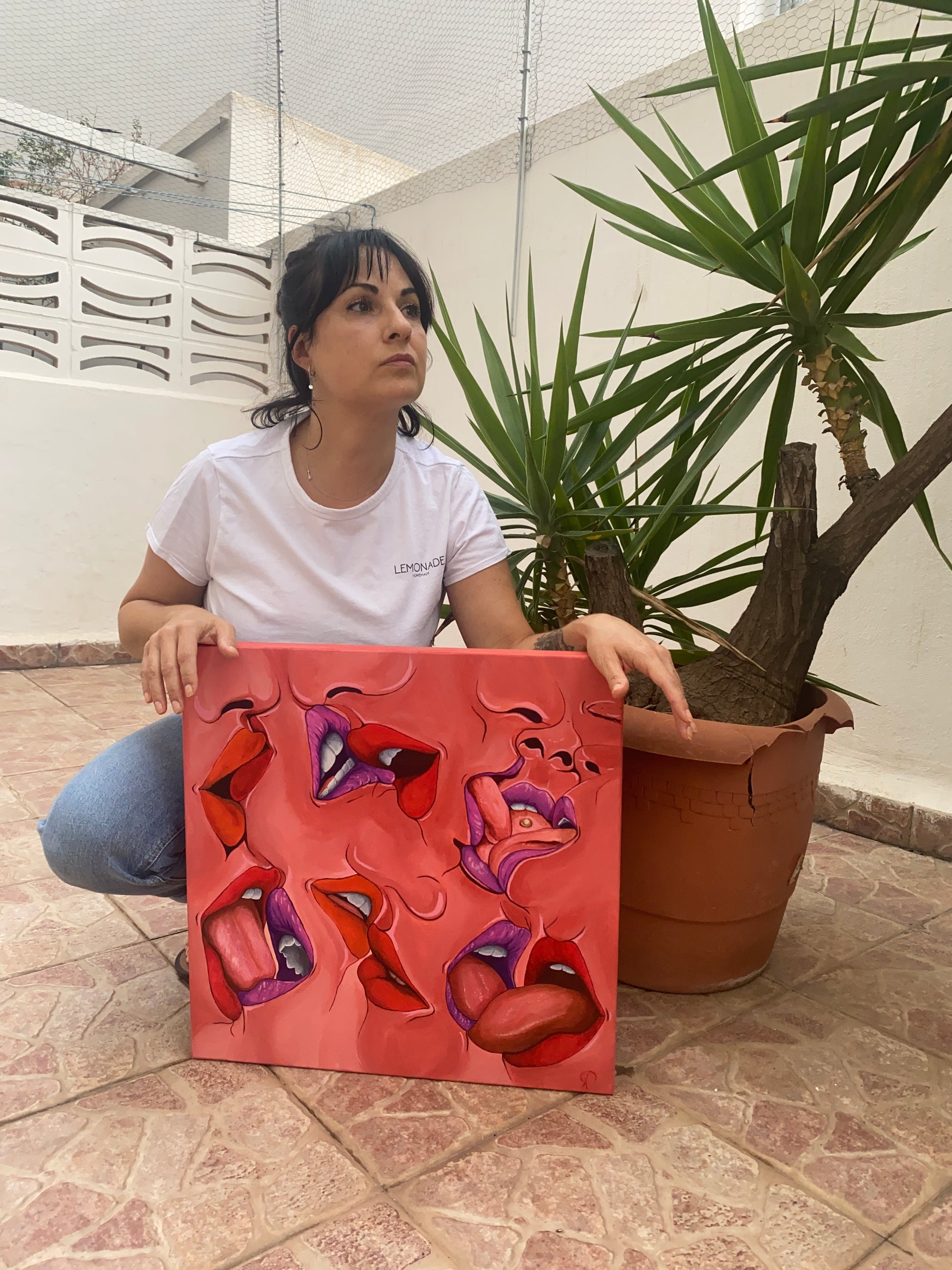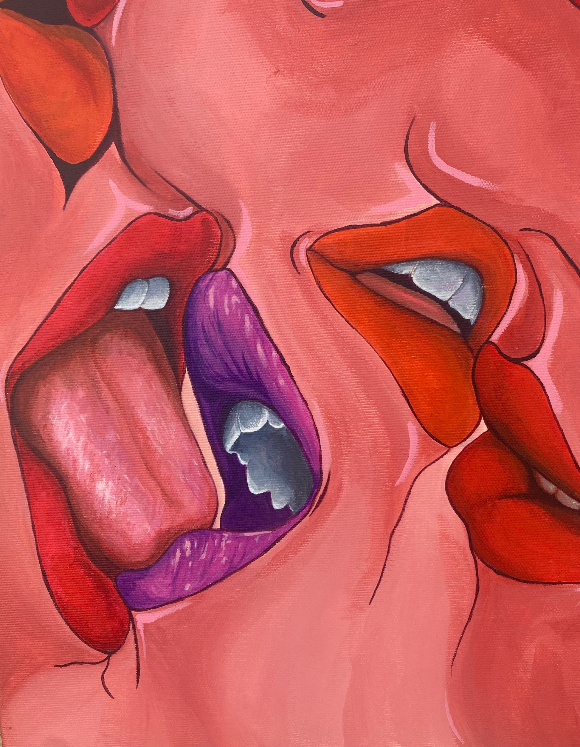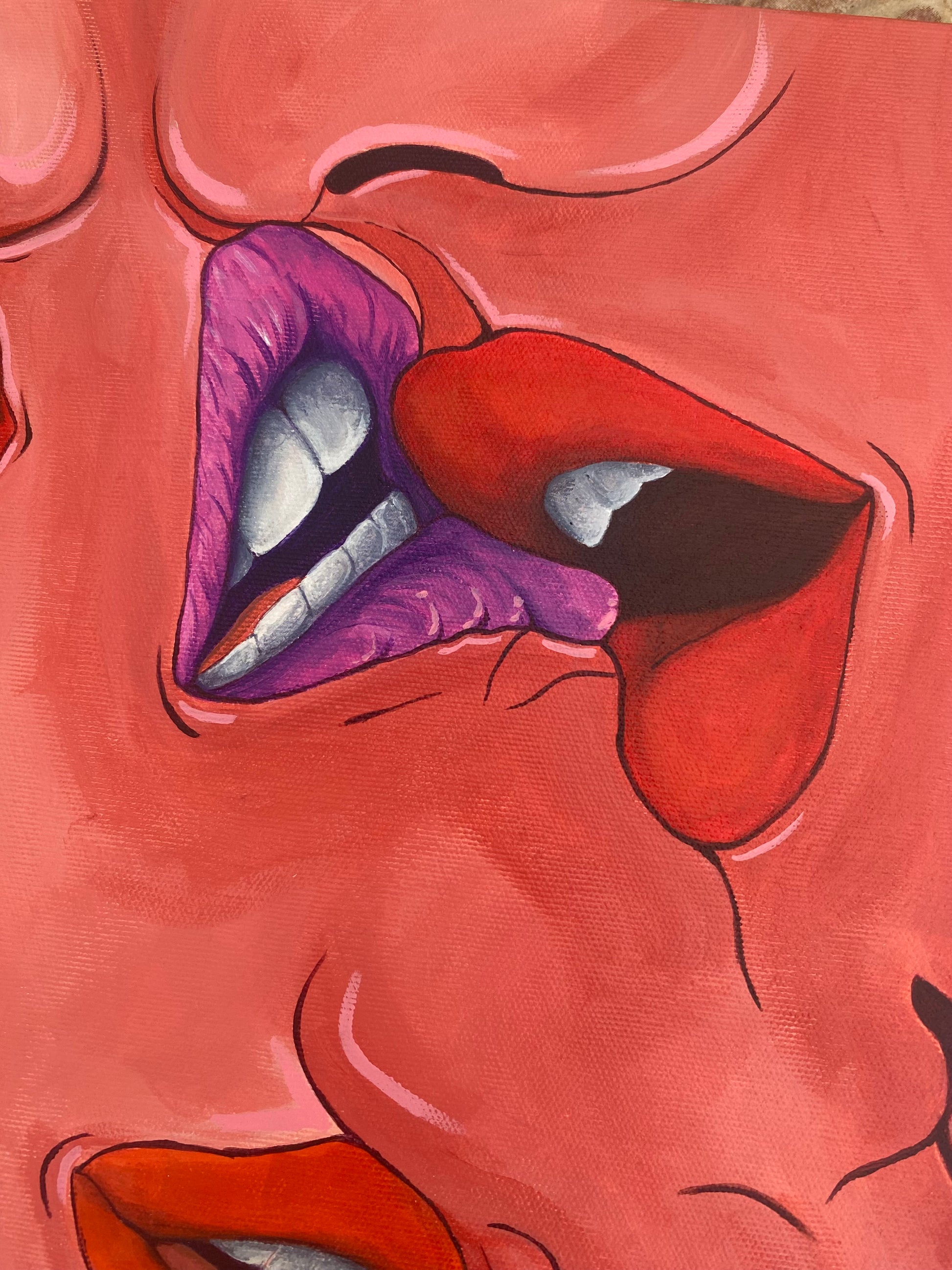 Con esta obra he querido visibilizar el poder emocional y la diversidad del beso como expresión, deseo, placer, dolor y contradicción. A través de una paleta intensa de rojos y morados, múltiples labios y lenguas emergen en una danza fragmentada que evoca lo íntimo, lo visceral y lo reprimido. Cada boca parece contar una historia propia, generando una tensión entre lo sensual y lo simbólico.